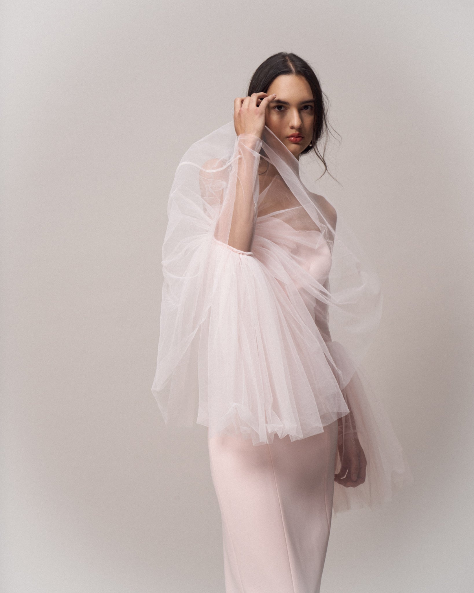 Asmmetrical Tulle Draped Gown With Side Train