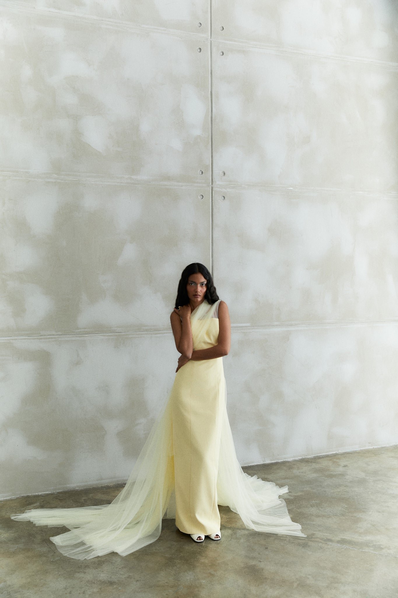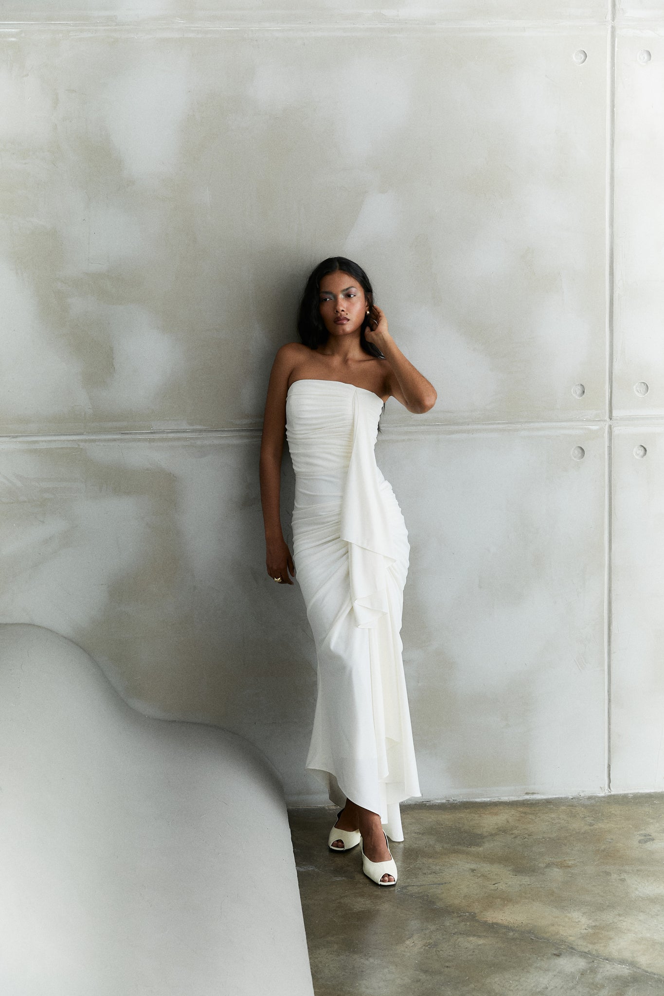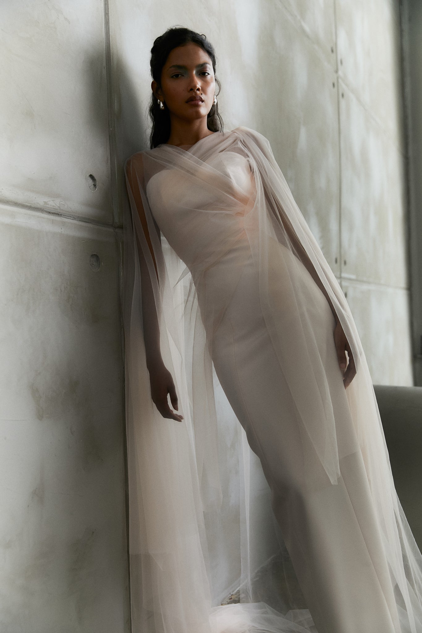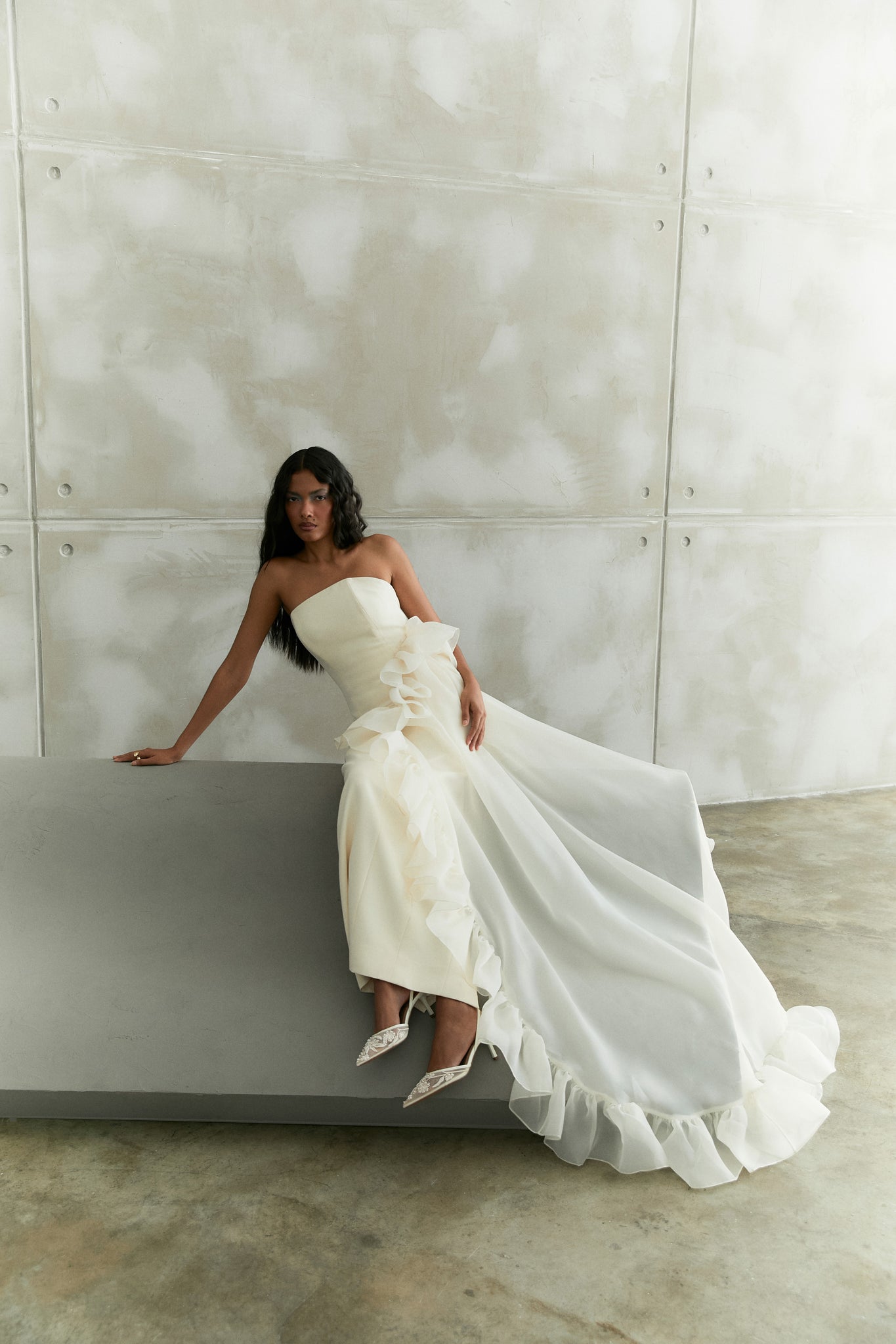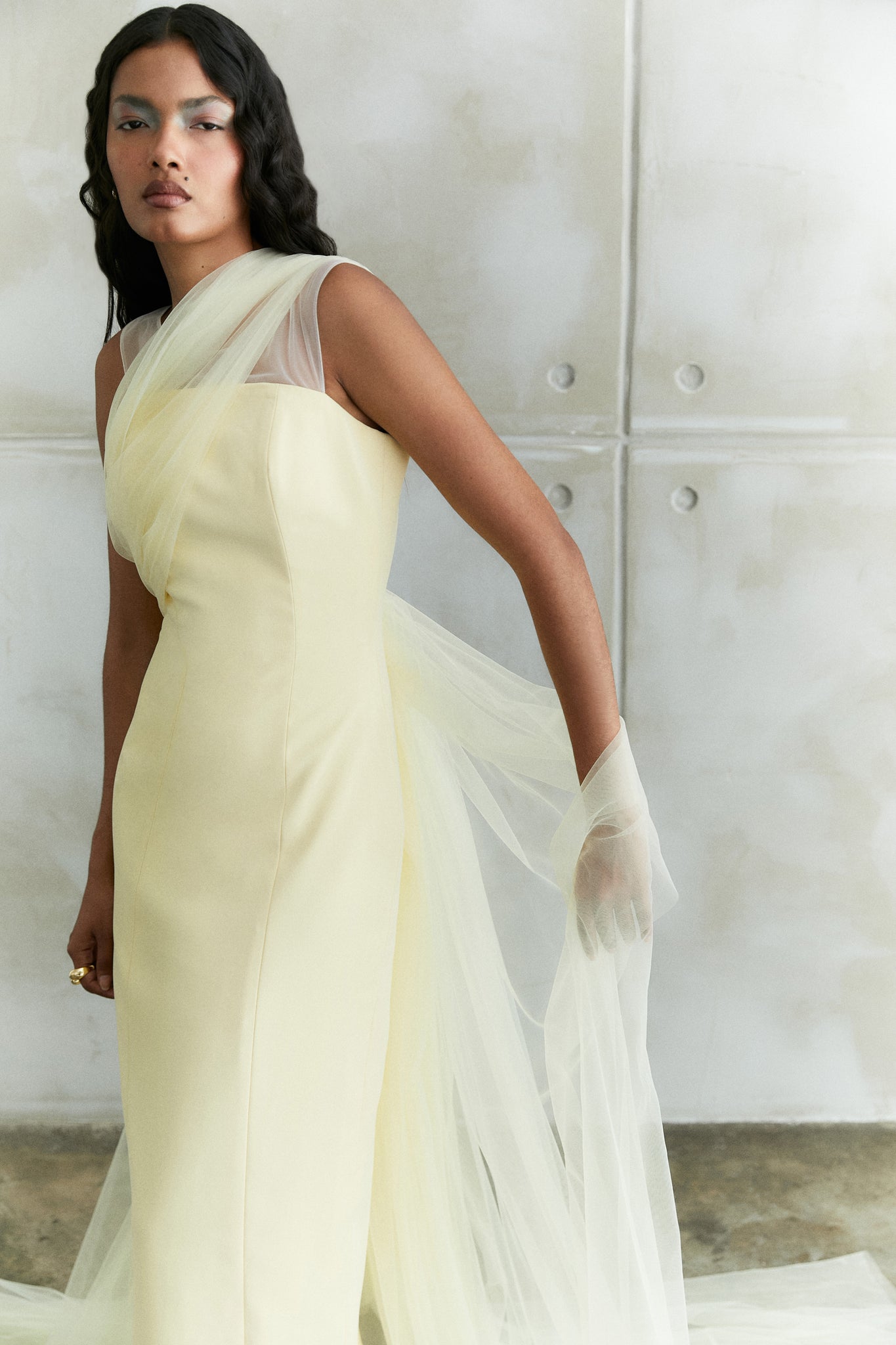 Strapless Crepe Gown With Gathered Soft Tulle Train