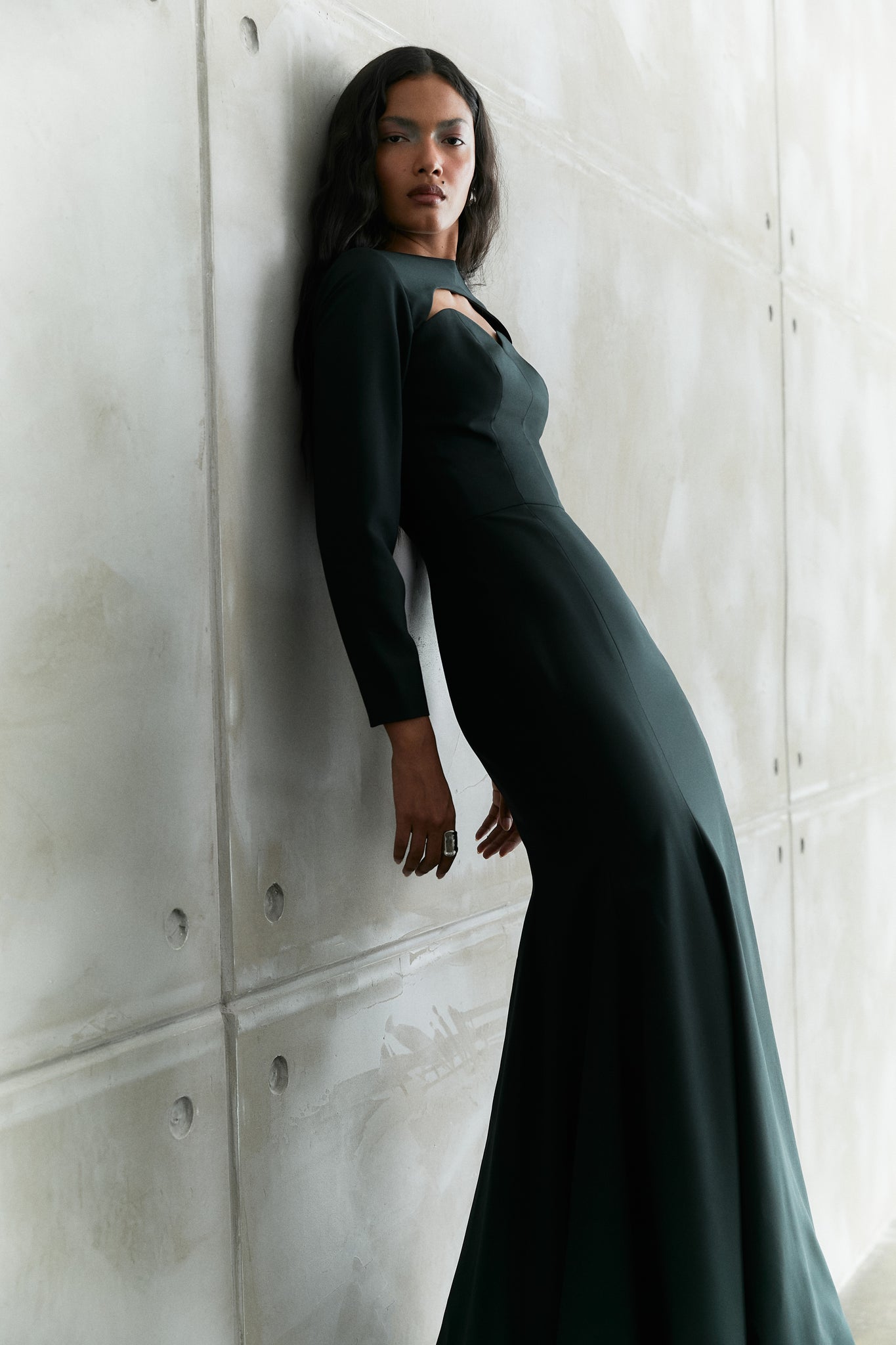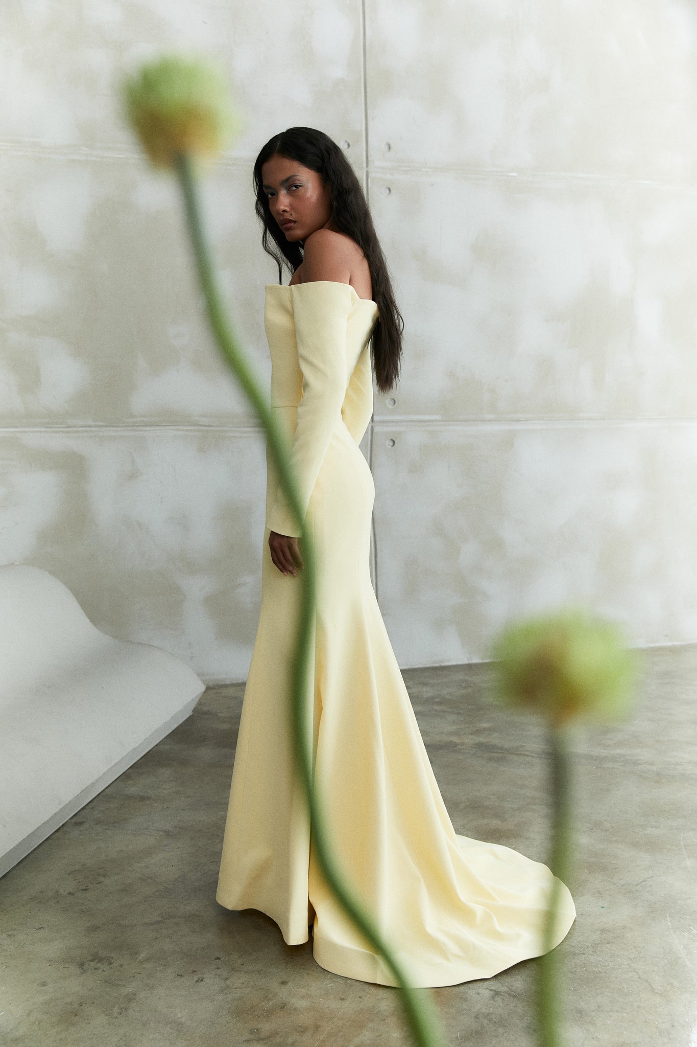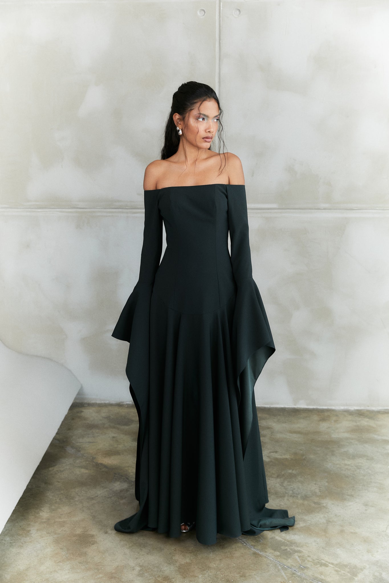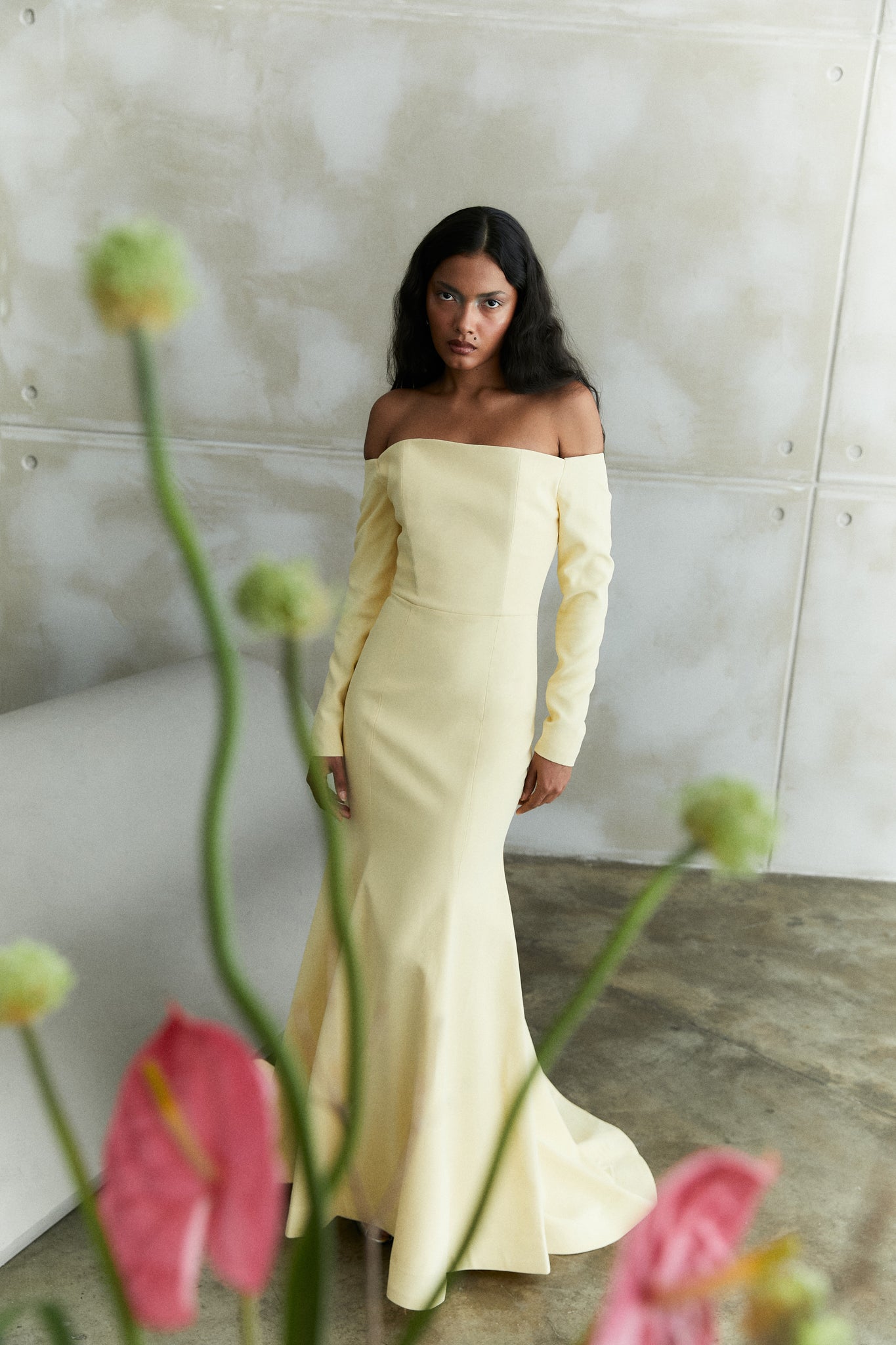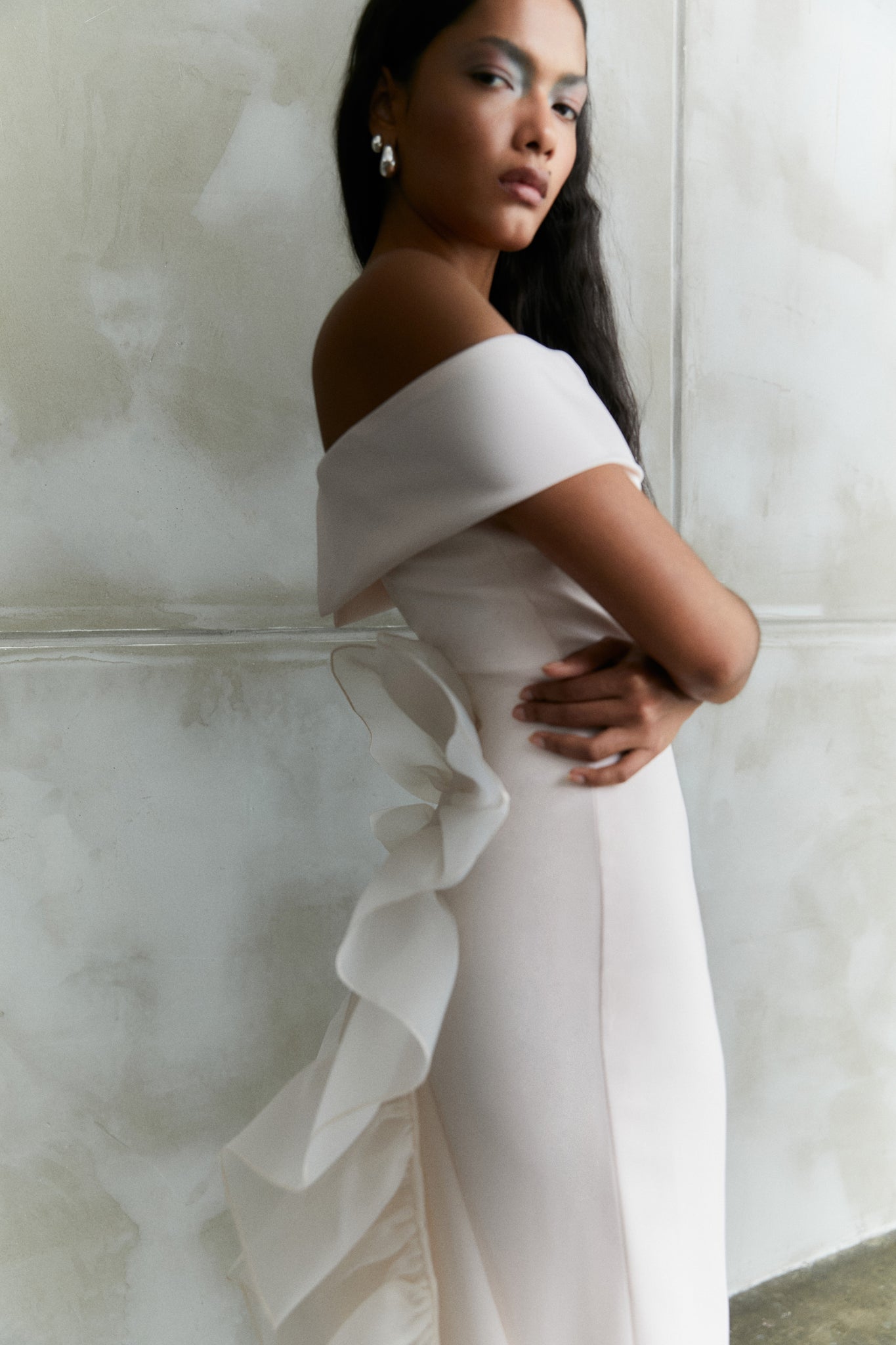 Off-Shoulder Mermaid Crepe Gown With Structured Neckline
