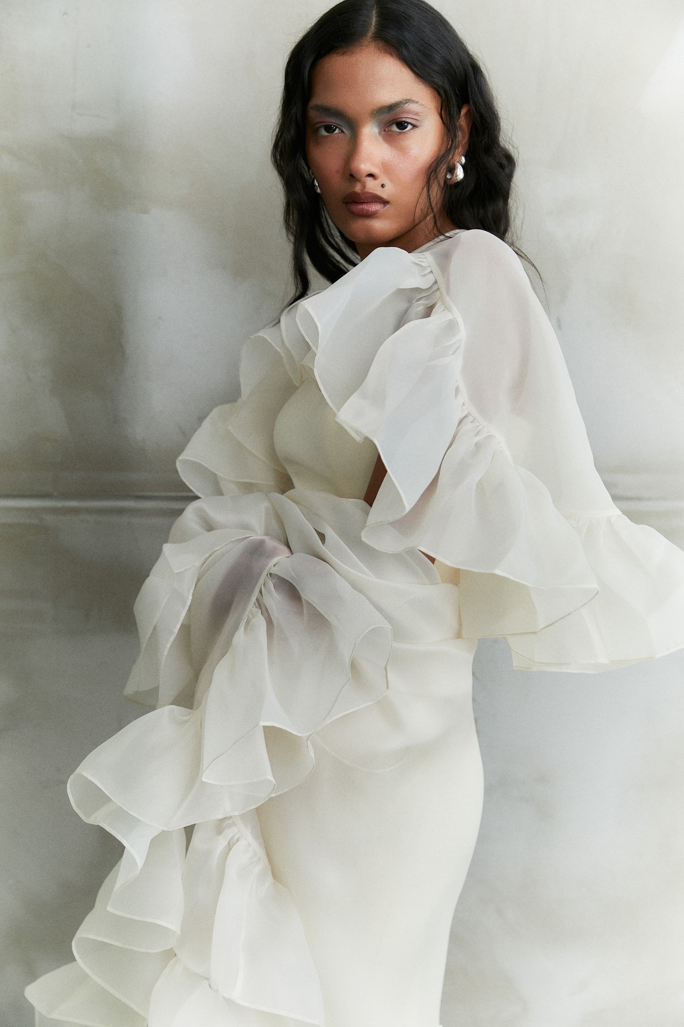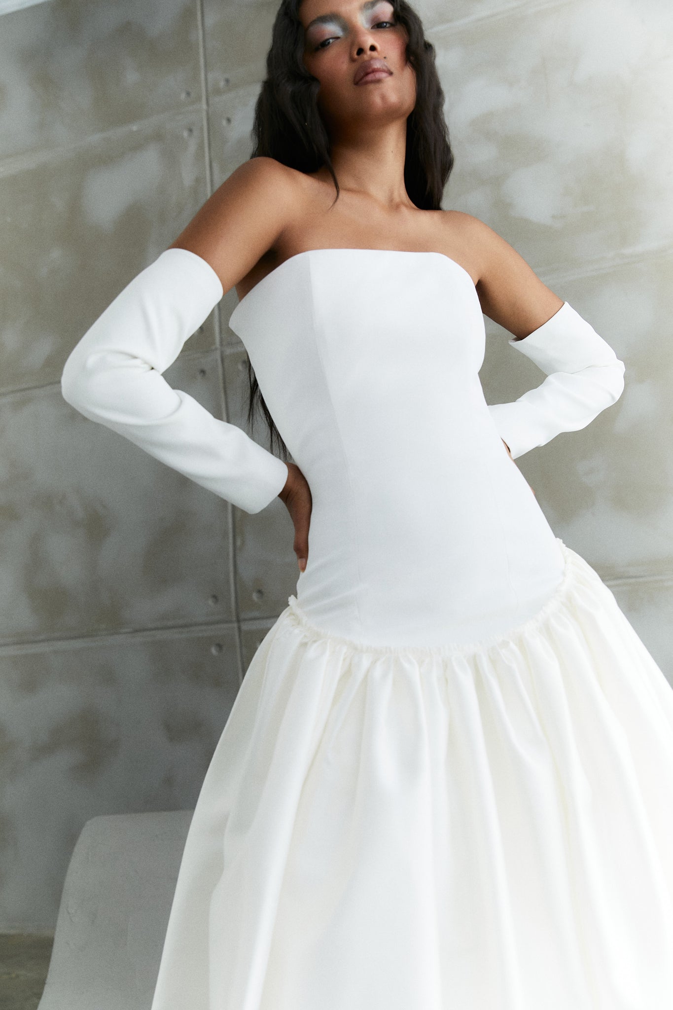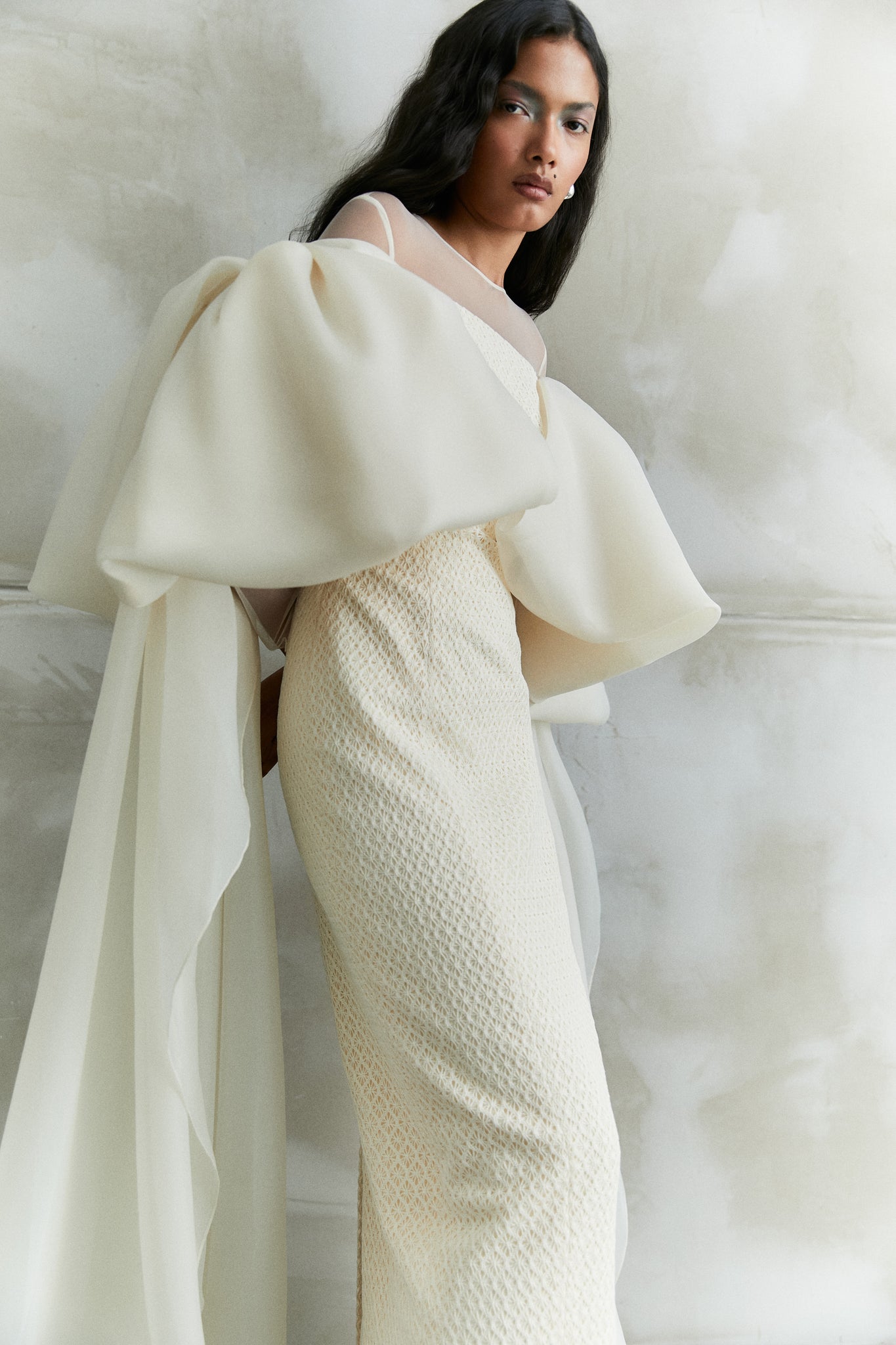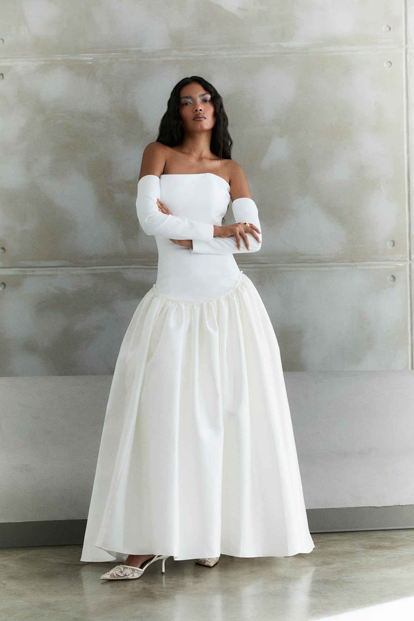 Off-Shoulder Crepe Gown With Puff Mikado Skirt