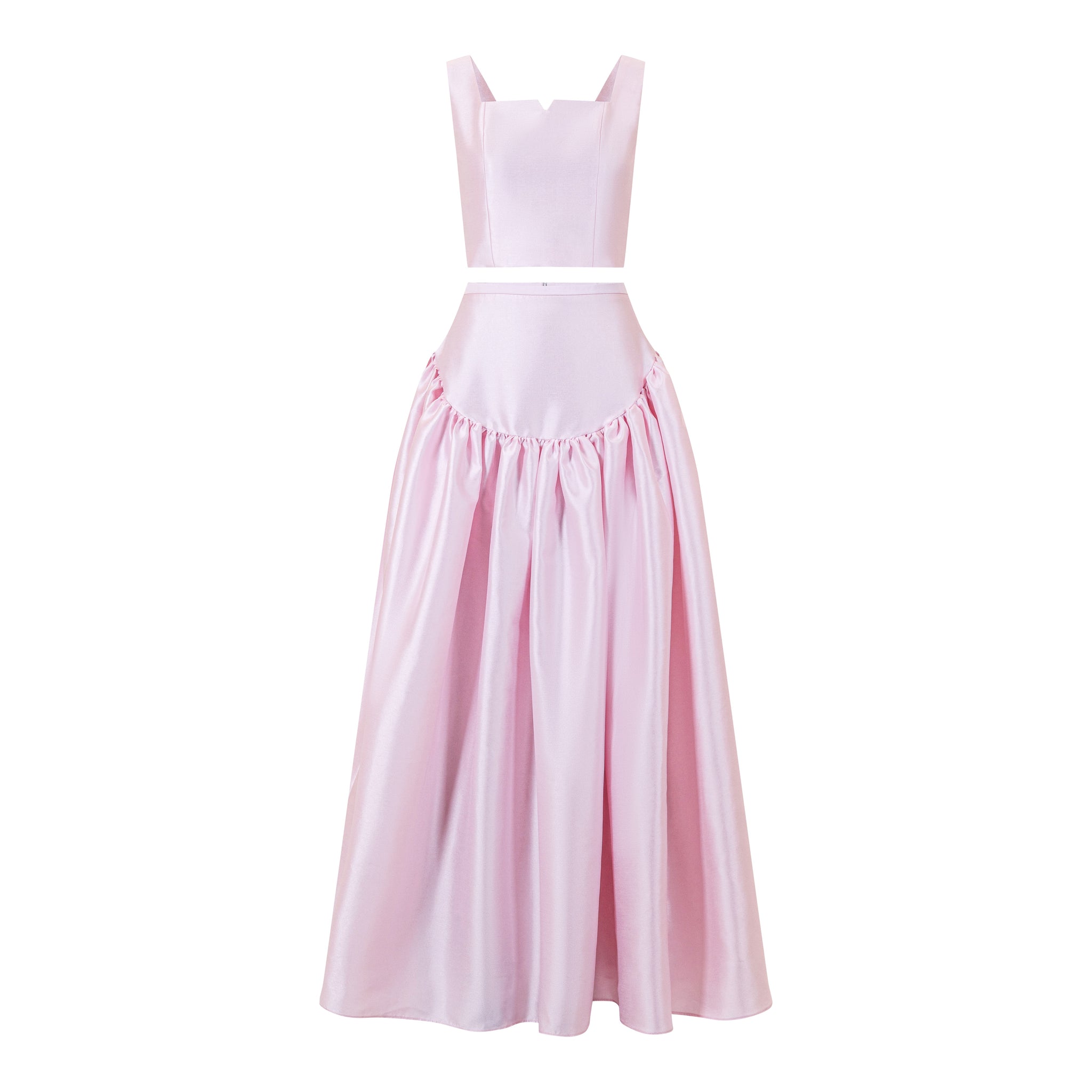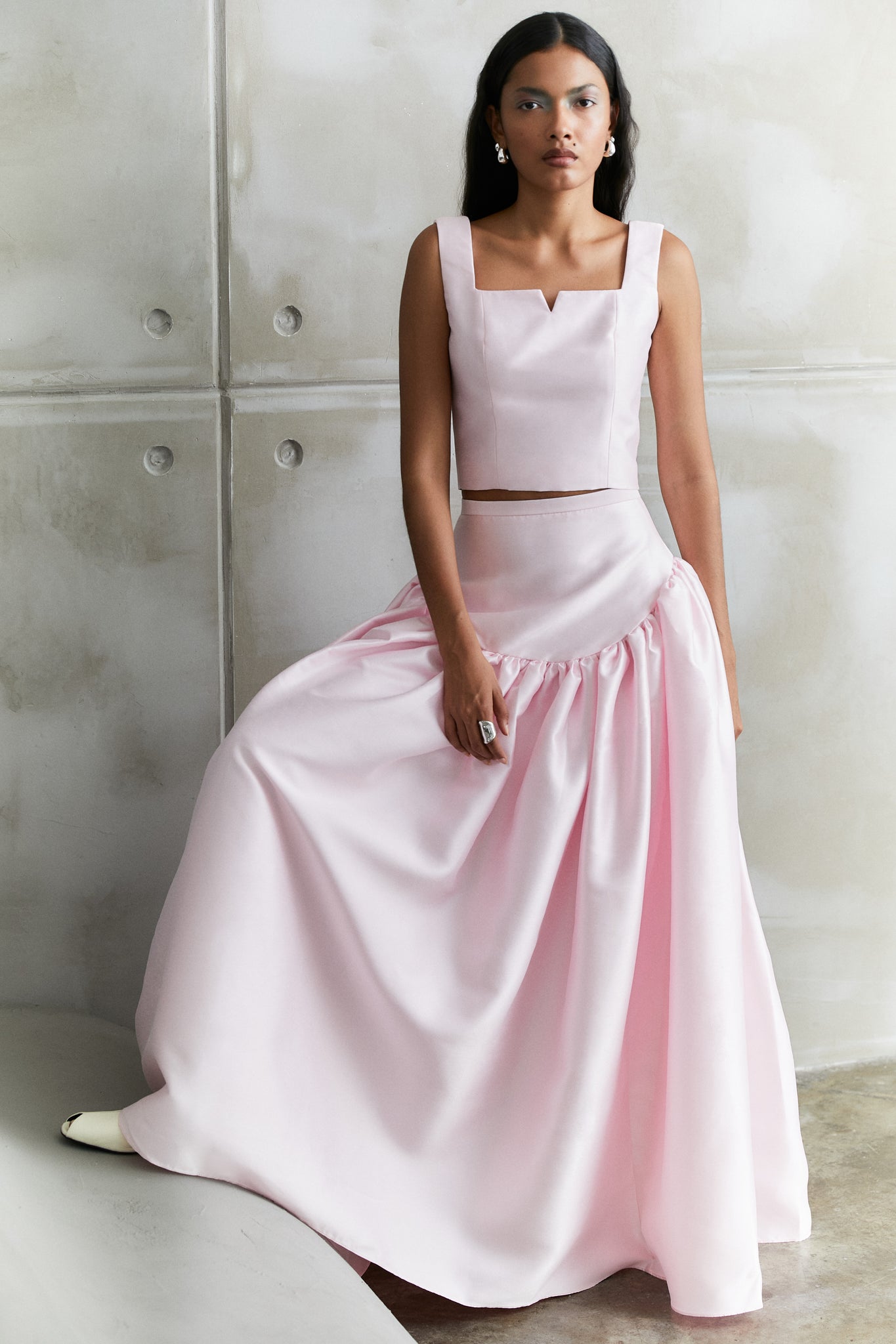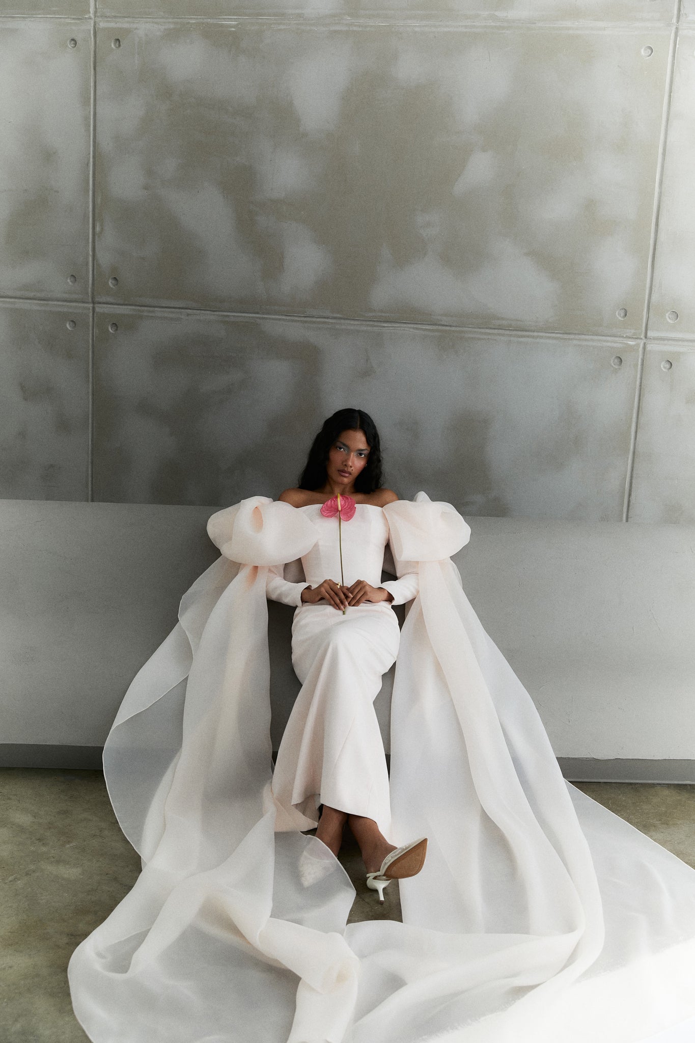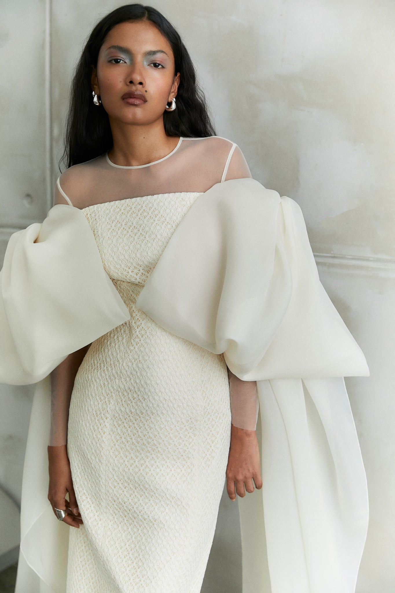 Off-Shoulder Crepe Gown With Puff Mikado Skirt