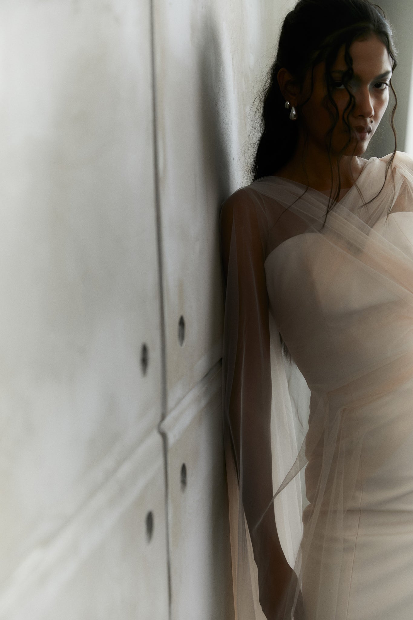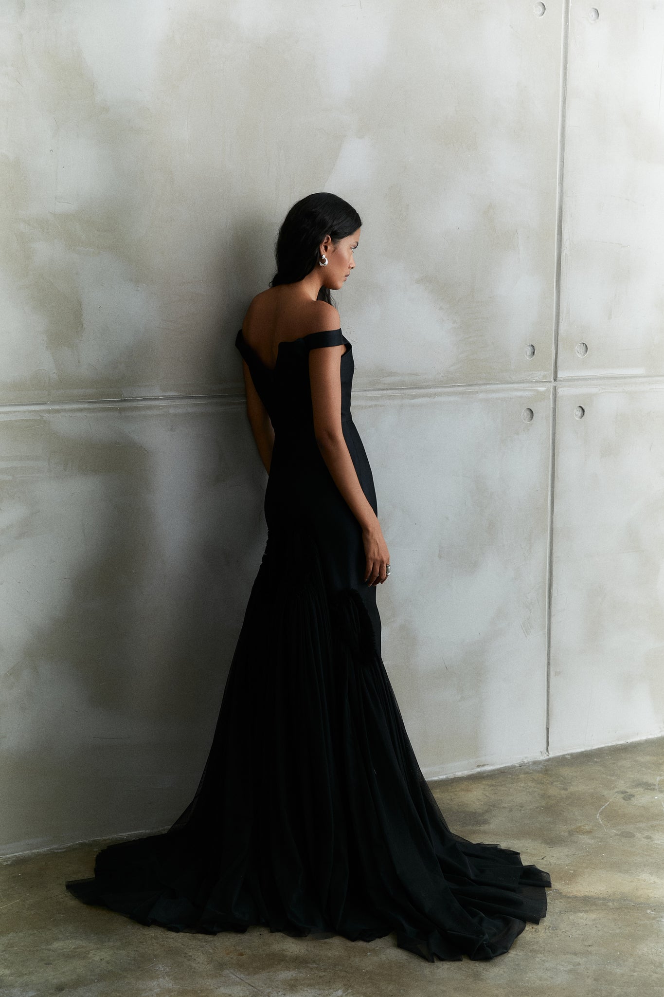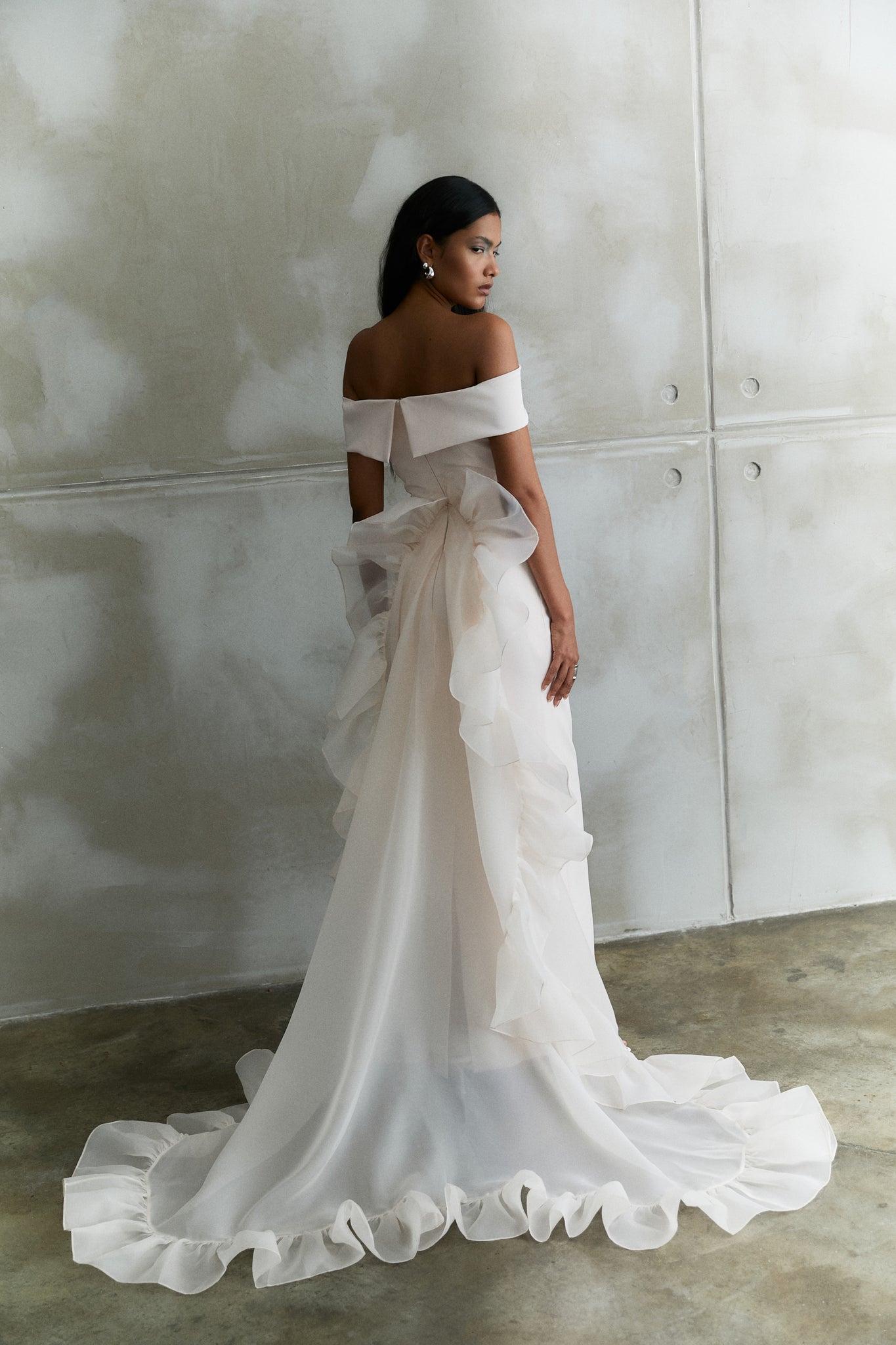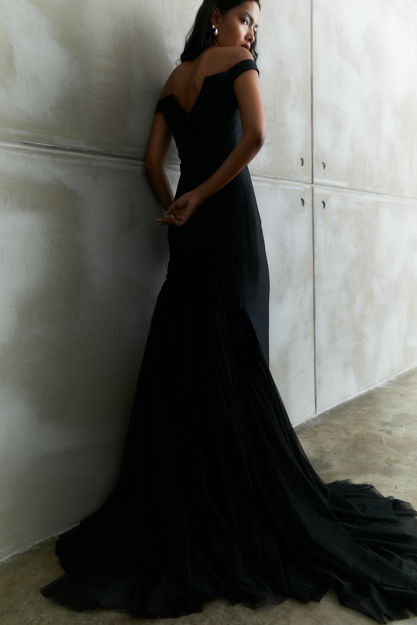 Off-shoulder Mikado Crepe Gown With Soft Tulle Bustle