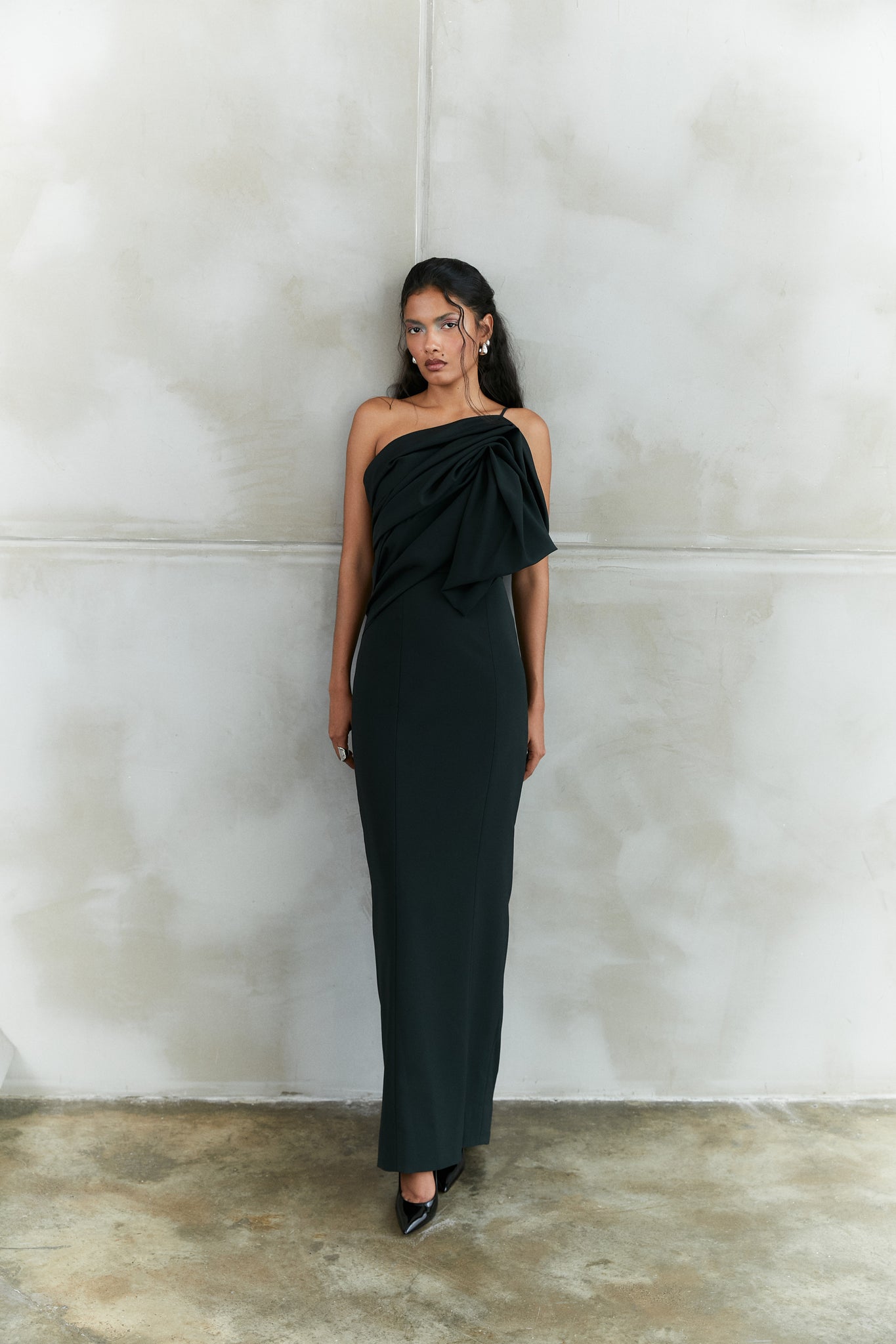 Off-shoulder Crepe Gown With Large Organza Bow At Shoulder